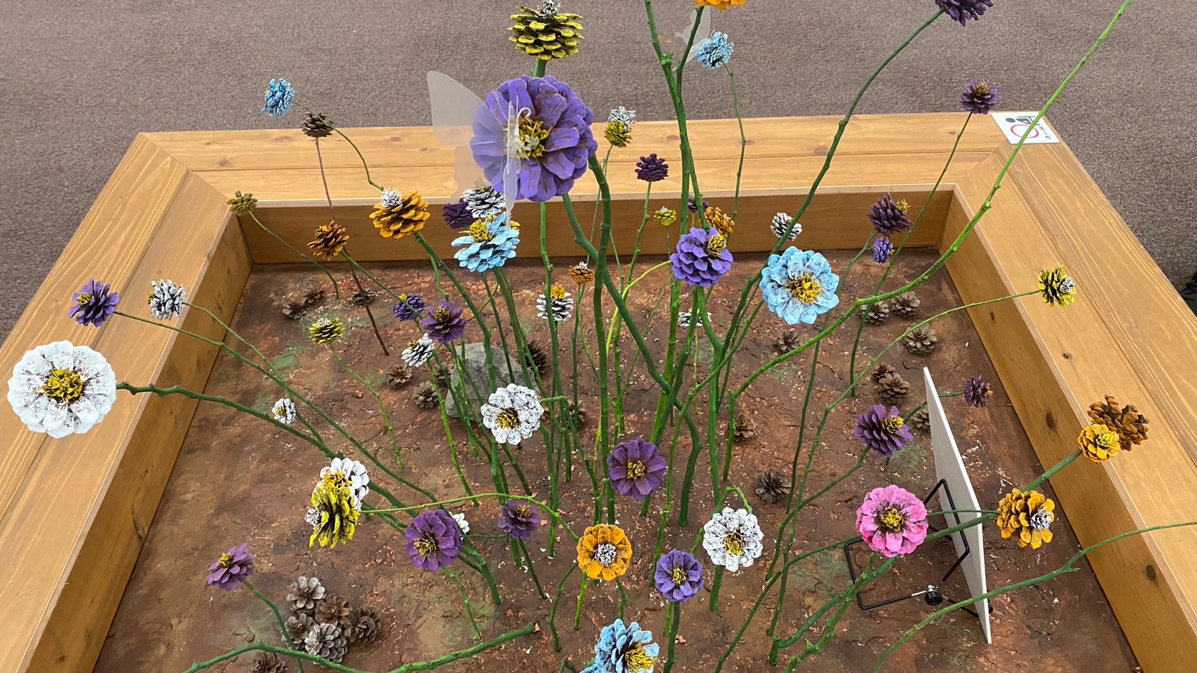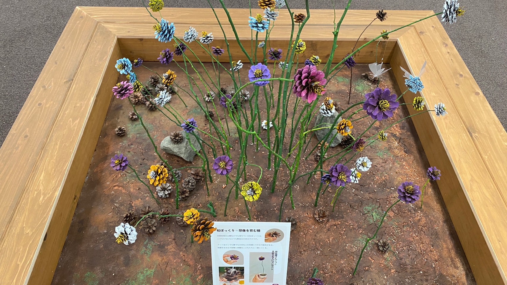つくった松ぼっくりのお花になります。
