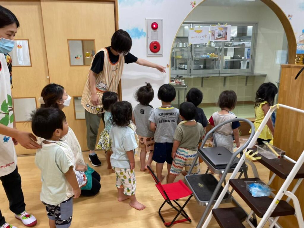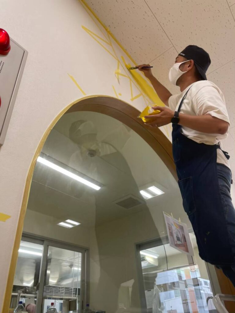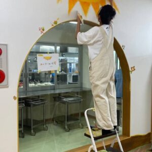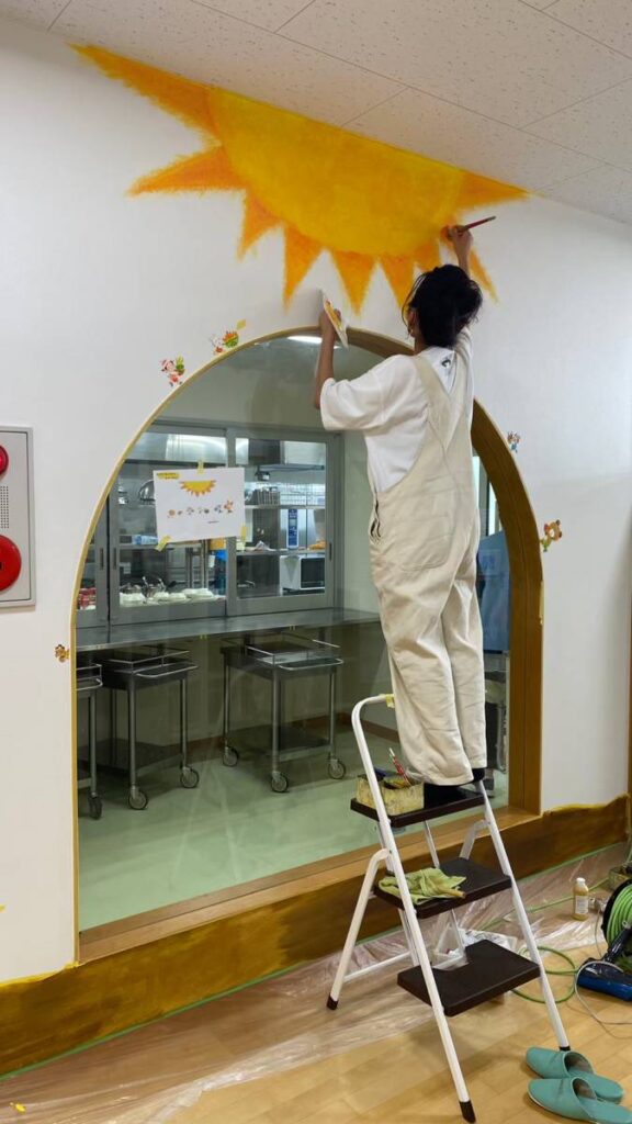 新潟のこども園にて、アートライブを実施しました。このプロジェクトでは、厨房の壁面に明るく元気なお日様をメインモチーフとし、食育や野菜の実りを感じる絵柄を園児たちの前で描きました。