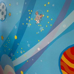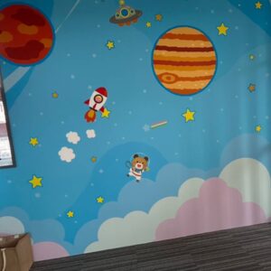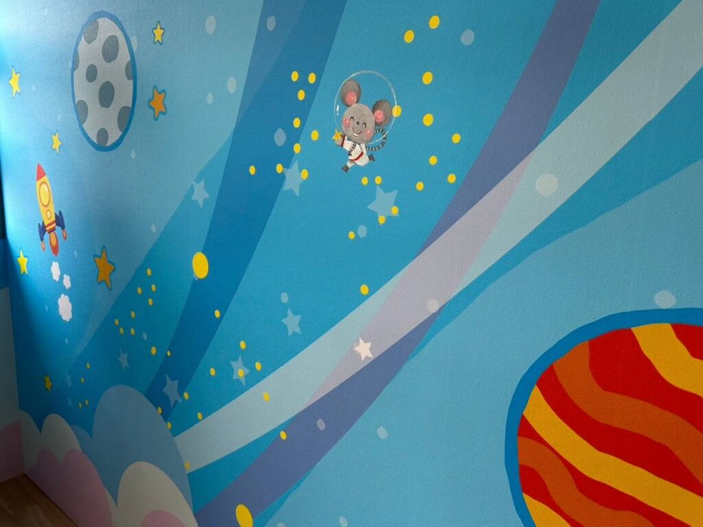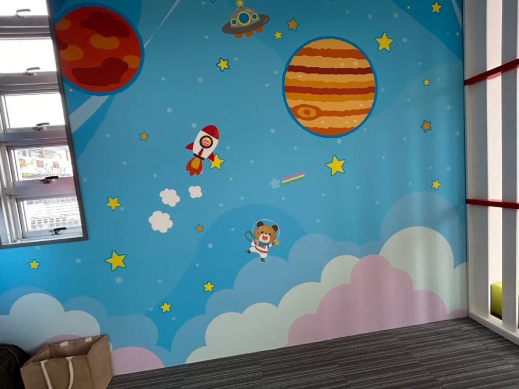 - 壁面には星や惑星のイラストを描き、子どもたちがまるで宇宙にいるかのような体験ができる空間を実現しました。