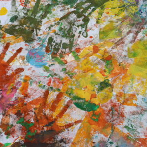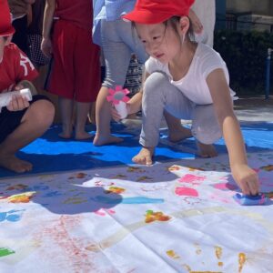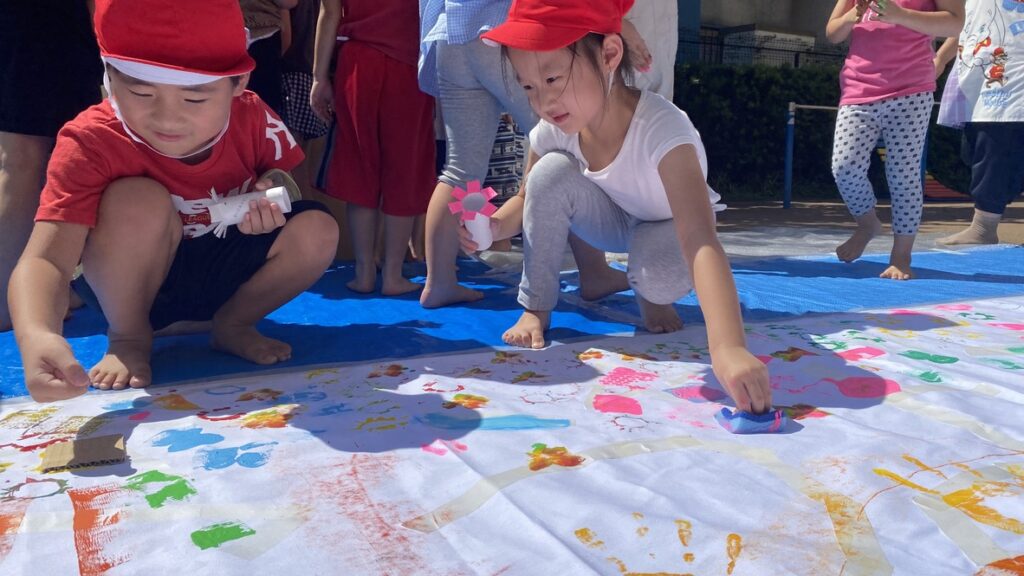 この画像は、幼稚園で行ったスタンプアートの光景を写しています。私たちは、真っ白な布をキャンバスにして、ダンボールやペットボトルのキャップ、プチプチシート、木の実や葉っぱなど、様々な素材をスタンプとして使用しました。子どもたちは、それぞれの思うままに模様や形を楽しみながら彩っていきます。